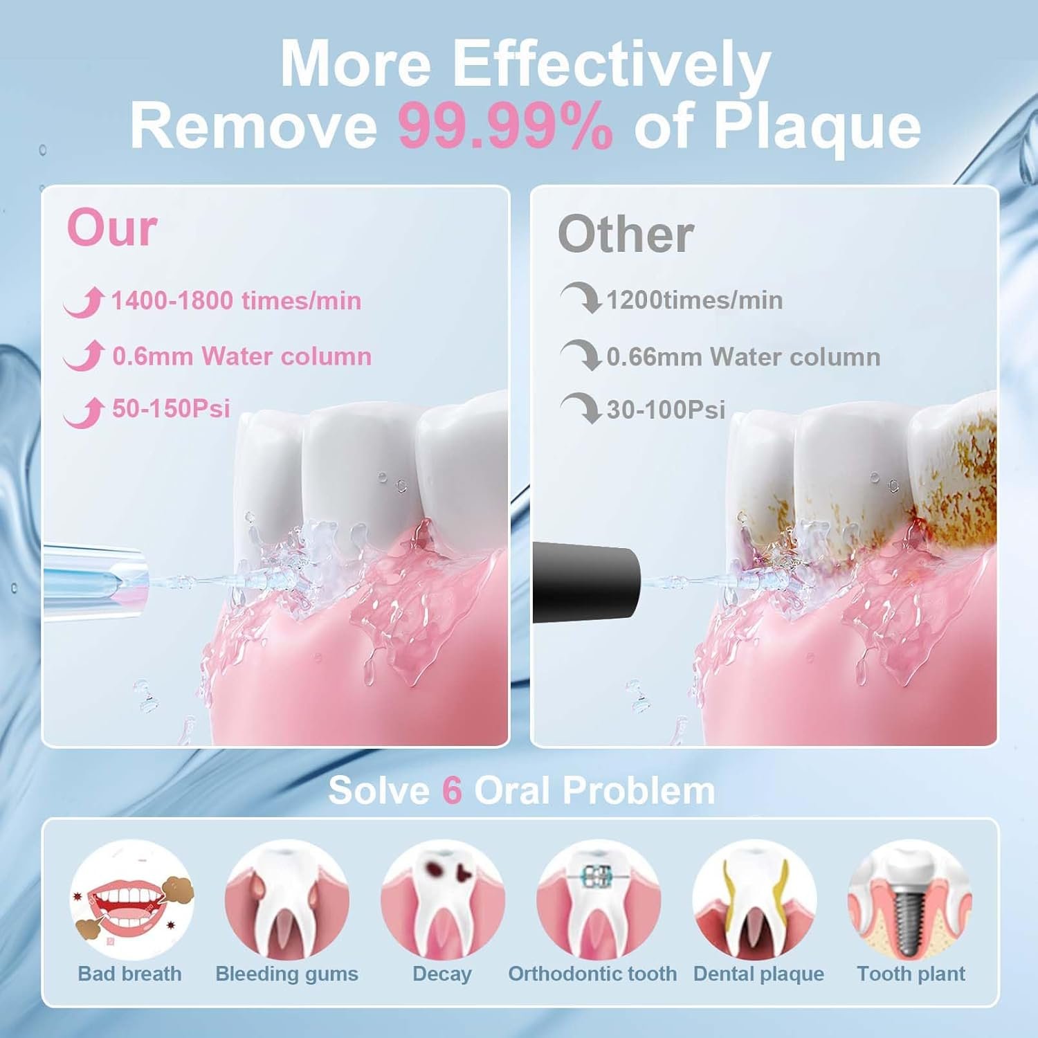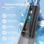 - 5 Modes to Experience Different Cleaning Options – Cordless water flosser features 5 modes with 5 pressure levels (Strong mode – 150 PSI, Normal mode – 120 PSI, Soft mode – 90 PSI, Pulse mode – 70-120 PSI, and Child mode – 50 PSI). It’s ideal for users seeking both gentle and deep, powerful cleaning (For first-time users, we recommend starting with child mode and gradually transitioning to other modes.)