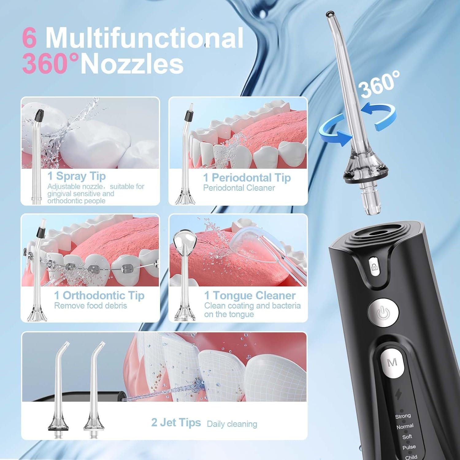 - 360° Rotatable Nozzle, 6 Replacement Tips – Worried about not being able to rotate the nozzle or it being fixed in one direction? No worries! This water flosser features a 360° rotatable nozzle, allowing you to adjust the angle for cleaning hard-to-reach areas and enhancing cleaning power
